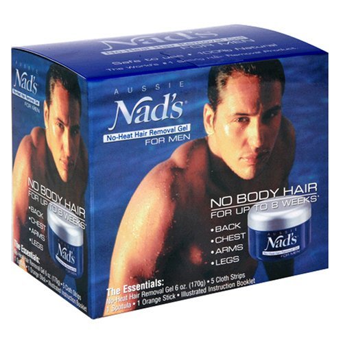 The Essentials: No-Heat Hair Removal Gel (6 oz/170 g); 5 Cloth Strips; 1 Spatula; 1 Orange Stick; Illustrated Instruction Booklet. No body hair for up to 8 weeks (individual results may vary): Back; Chest, Arms; Legs. Safe to use. 100% Natural. The world's No. 1 selling hair removal product. Shred the competition without getting scratched up. Use Nad's No-Heat Hair Removal Gel for Men. It's all natural from Australia. It's a snap to use. And you can't beat the return on investment on your time: one app. keeps you sleek for up to 8 weeks! Perfect for weightlifter, cyclists, swimmers, and guys who generally want to look good and get touched. No heat means no burning. Forget about wax. Nad's For Men works with your body heat. Use it straight from the jar. Just smooth it on and lift away unwanted hair. Its pure, water-soluble ingredients rinse away cleanly. No muss. No fuss. No heat. No hair. All natural and chemical free. Nad's For Men is the fresh way to remove unsightly body hair - without chemicals. Australian made. Nad's comes ready to use. Washes away with water. No heating. Melts with body heat. 100% Natural. Easy to use. Ready to use. Safe to use. Washes away with water. Made in Australia.